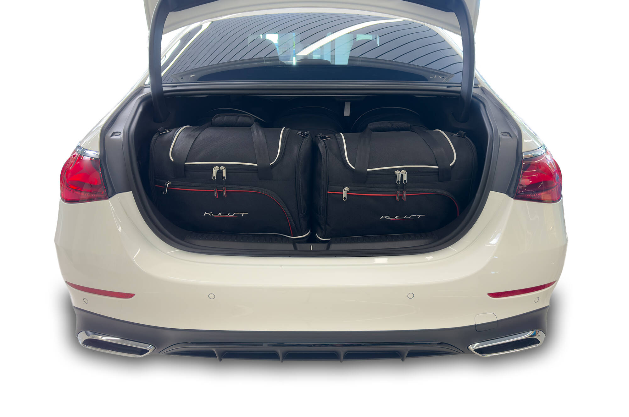 The bags fill every square inch of the boot thanks to their slanted sides that match the angle of the rear seats. This is a unique feature of KJUST car bags.